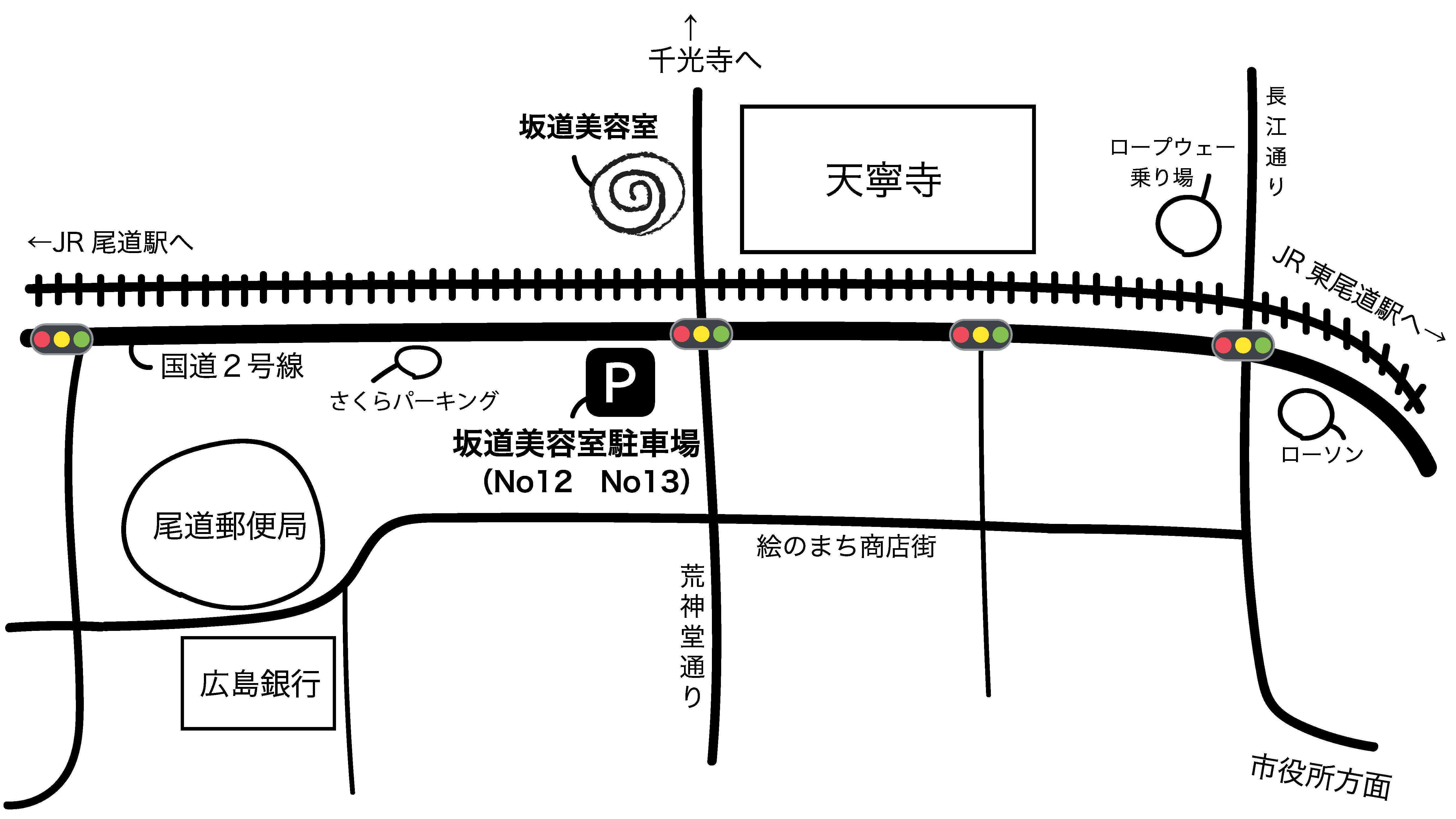 坂道美容室・専用駐車場のご案内です。お店から徒歩3~5分のところにあります(国道2号線沿い)。お車でご来店の際はこちらをご利用ください。